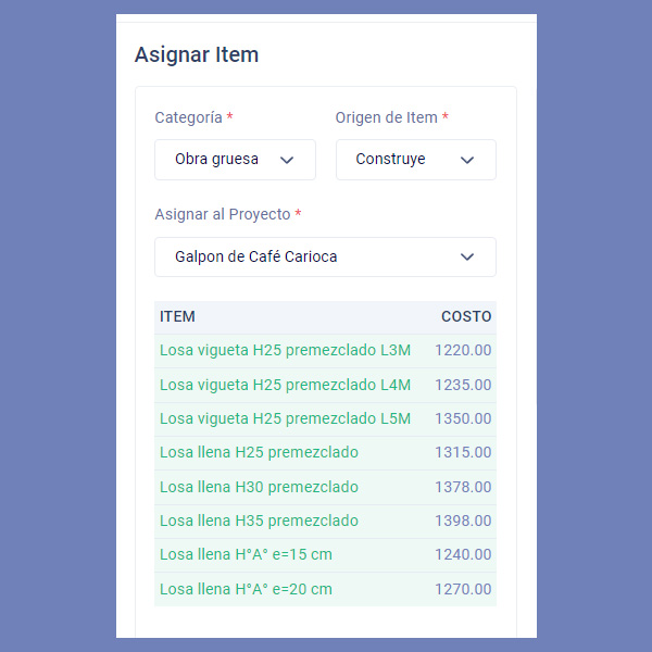 Primero debe seleccionar el proyecto, luego es asignar pinchando los ítems necesarios para el presupuesto según la categoría correspondiente.